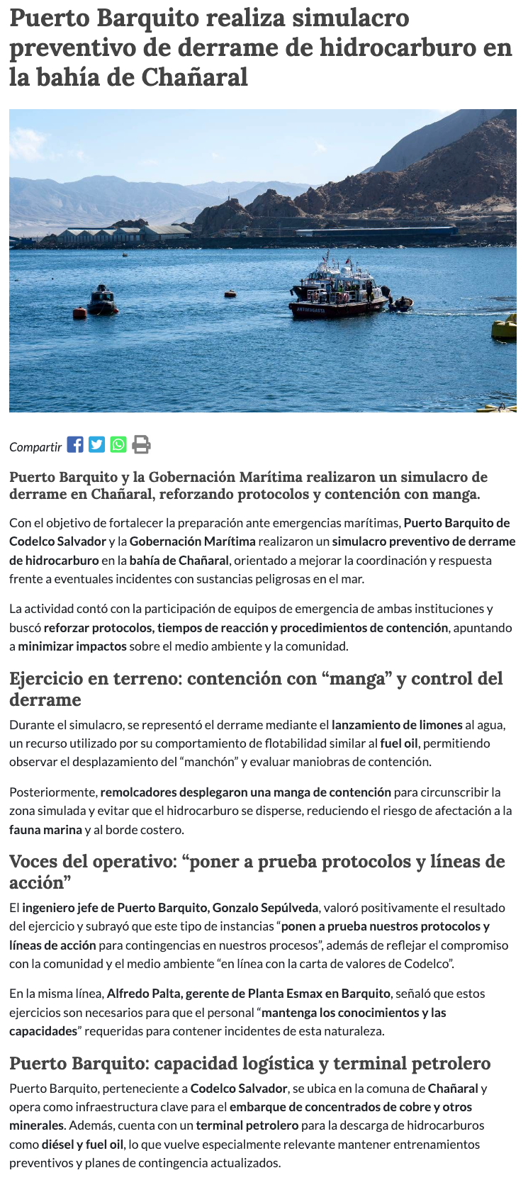 Realizan simulacro de derrame de hidrocarburos - (El Diario de Atacama)