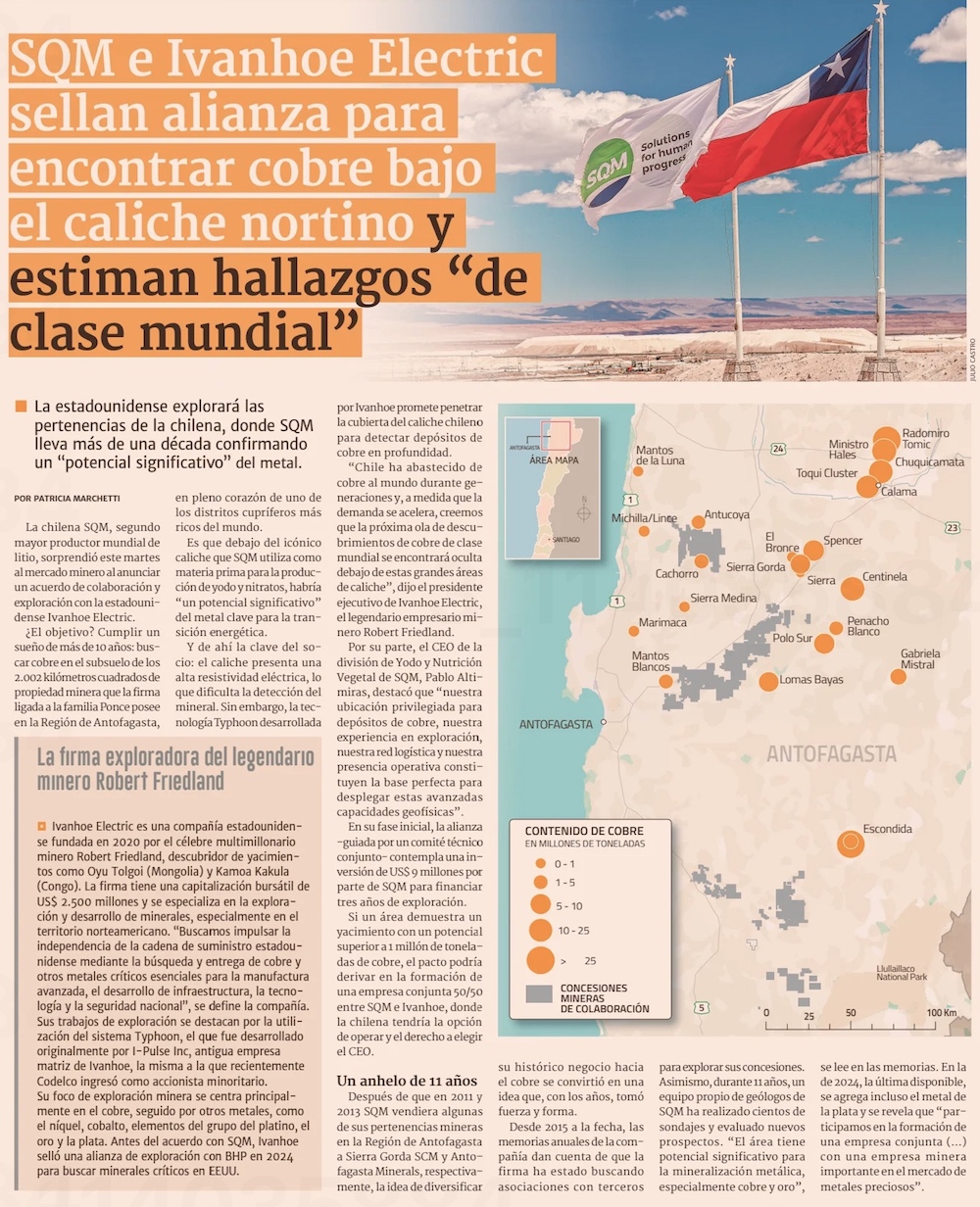 SQM anuncia alianza con estadounidense Ivanhoe Electric para buscar cobre en su propiedad en el norte - (Pulso)