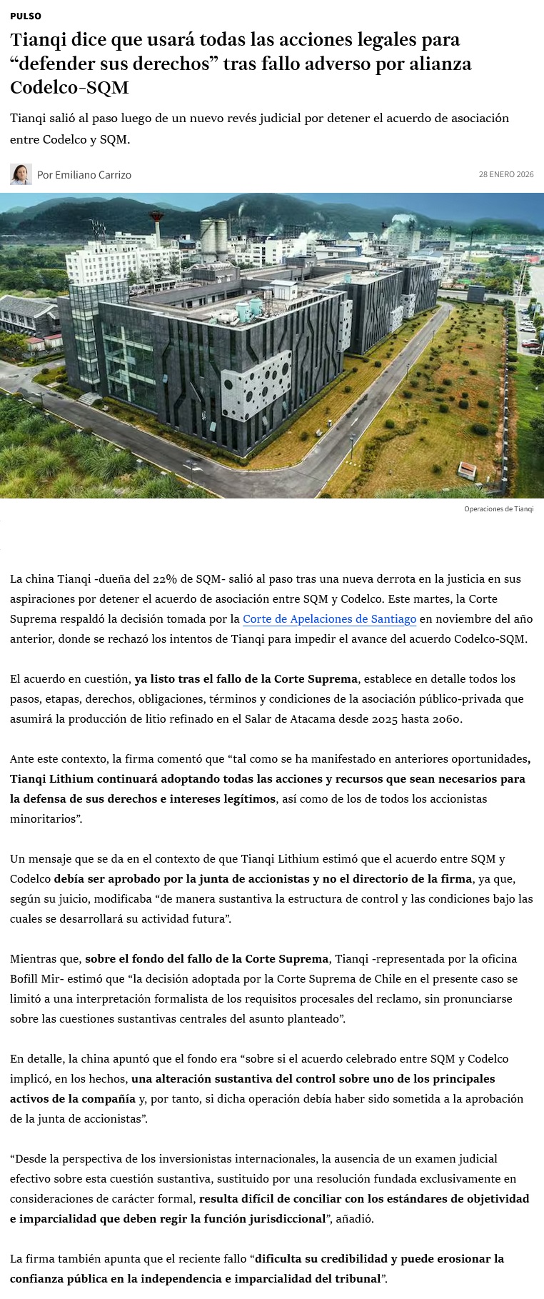 Tianqi acusa ausencia de "examen judicial efectivo" en fallo de la Corte Suprema - (Diario Financiero)