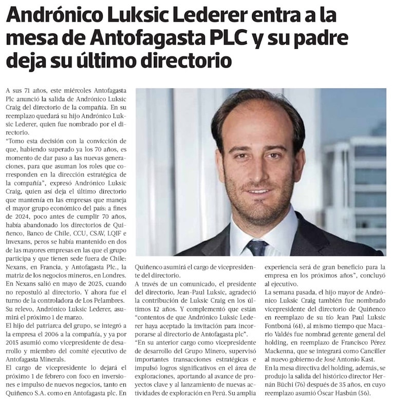 Andrónico Luksic Craig deja el directorio de la matriz de Antofagasta Minerals tras 12 años y es reemplazado por su hijo - (Diario Financiero)