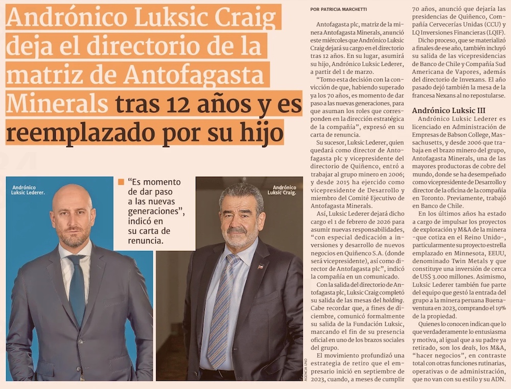 Andrónico Luksic Lederer entra a la mesa de Antofagasta PLC y su padre deja su último directorio - (Pulso)