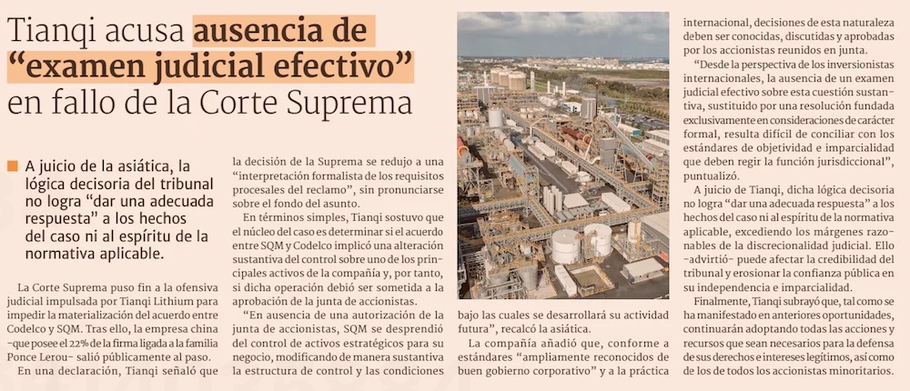 Tianqi no acepta portazo judicial: continuará "defensa de sus derechos" - (El Mercurio de Santiago)