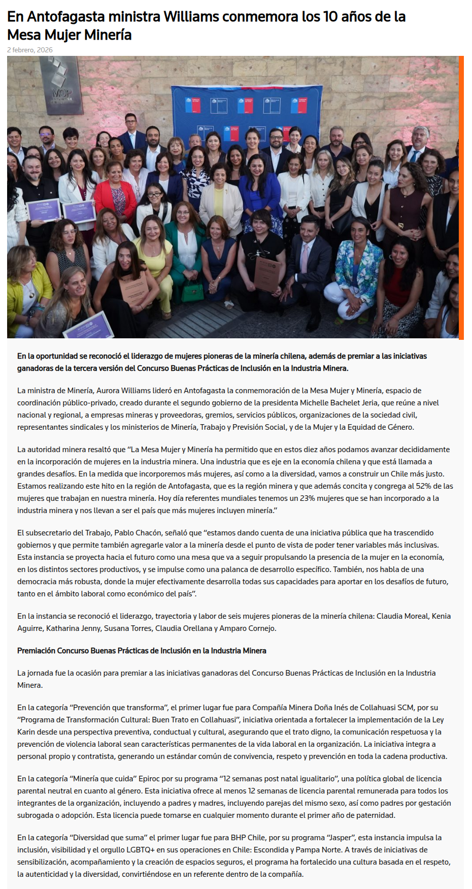 Conmemoran 10 años de la Mesa Mujer y Minería y premia inclusión en Antofagasta - (El Chañarcillo)