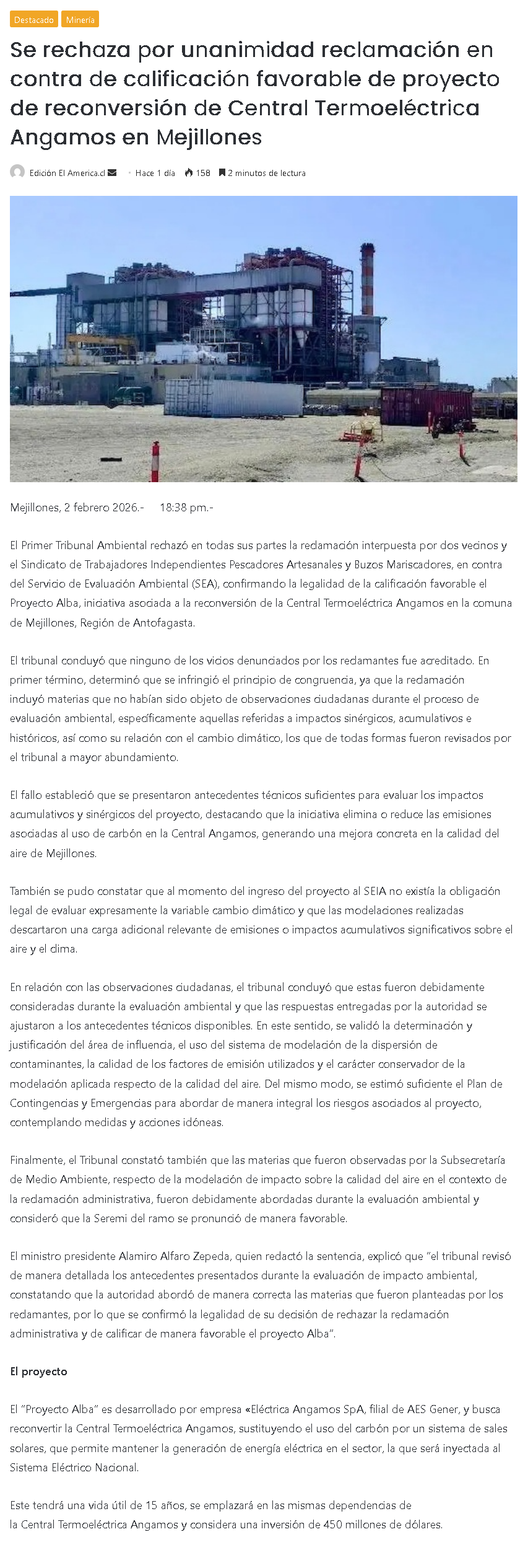 Ratifican aprobación ambiental de proyecto de reconversión de termoeléctrica en Mejillones - (induambiente.cl)