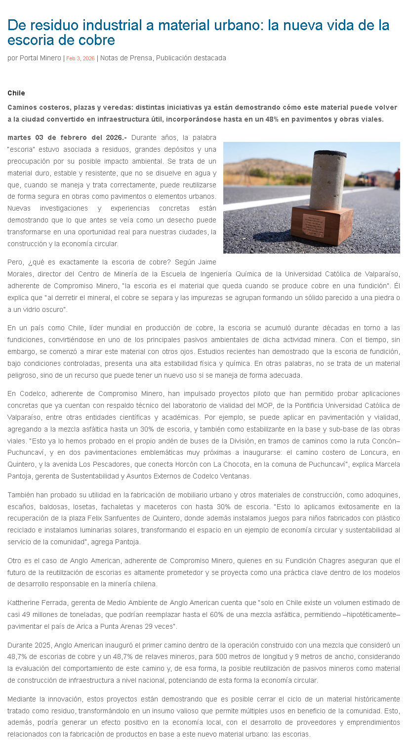 De residuo industrial a material urbano: La nueva vida de la escoria de cobre - (chilemineria.cl)