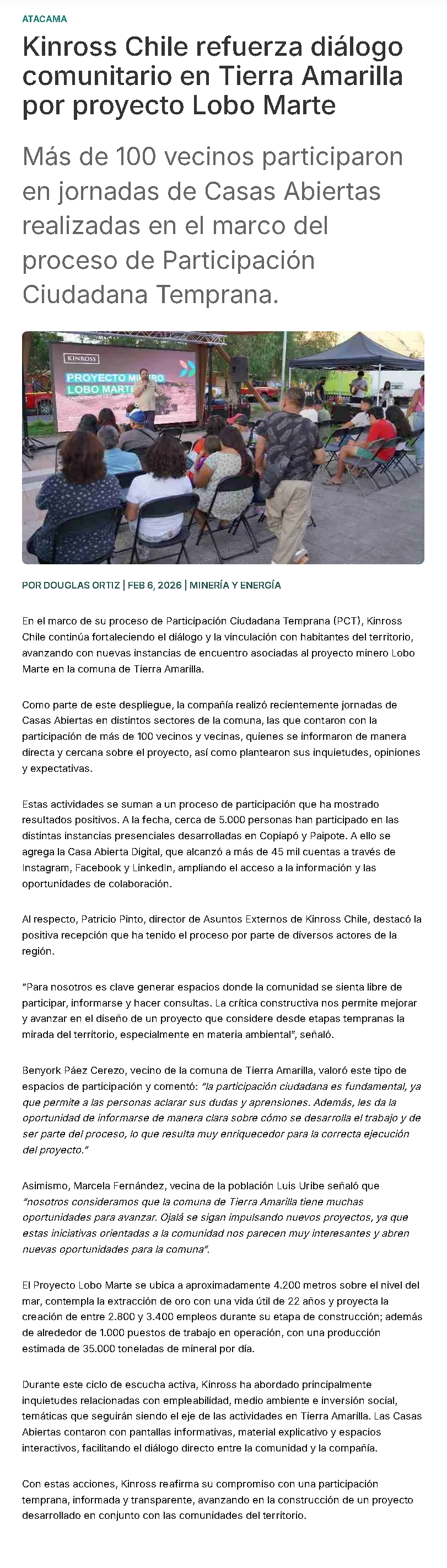 Kinross refuerza el proyecto Lobo Marte en Tierra Amarilla - (El Diario de Atacama)