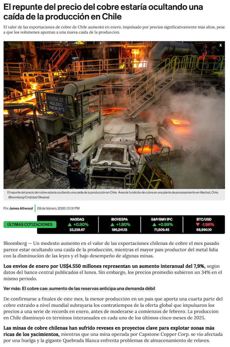 El estancamiento en la producción de cobre que se oculta en el alza de envíos al exterior - (El Mercurio de Santiago)