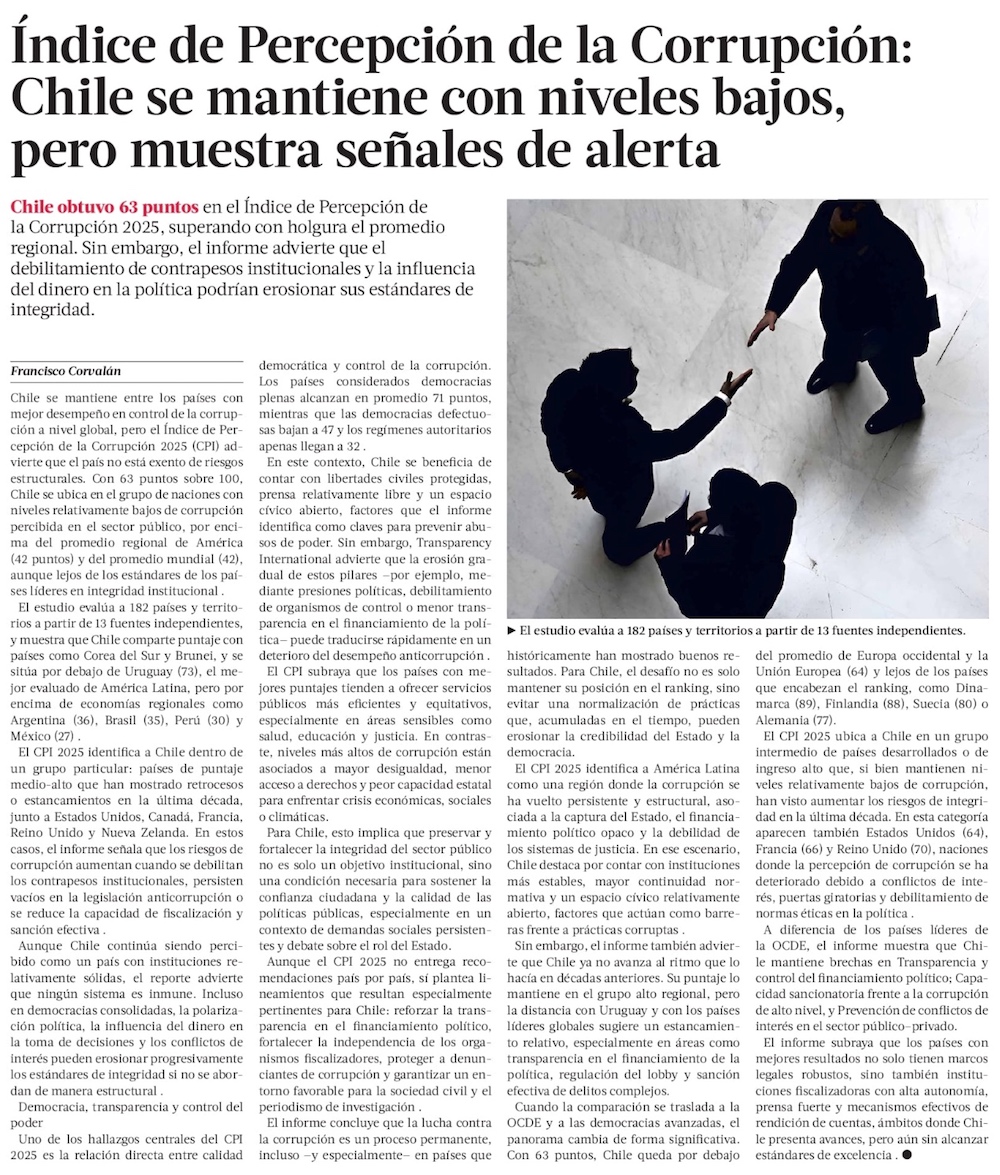 Chile detiene su caída en ranking global sobre corrupción, pero informe advierte "debilitamiento" institucional - (El Mercurio de Santiago)