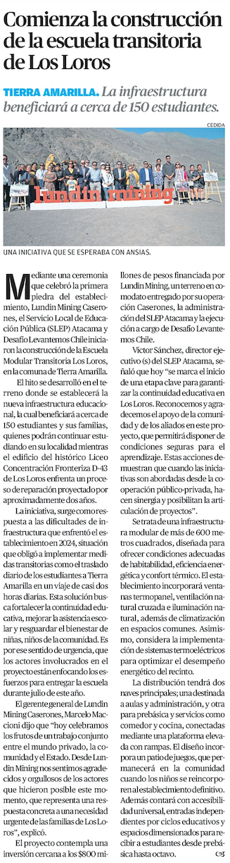 Comienza la construcción de la escuela transitoria de Los Loros que beneficiará a 150 estudiantes de la localidad de Tierra Amarilla - (El Chañarcillo)