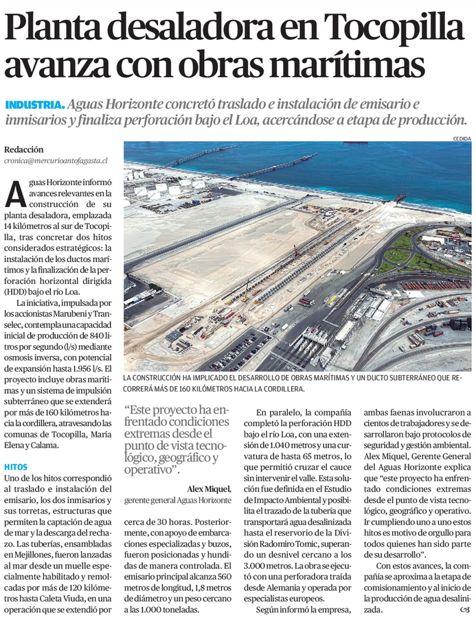 Aguas Horizonte concreta dos relavantes hitos constructivos en el desarrollo de su proyecto de desaladora - (mch.cl)
