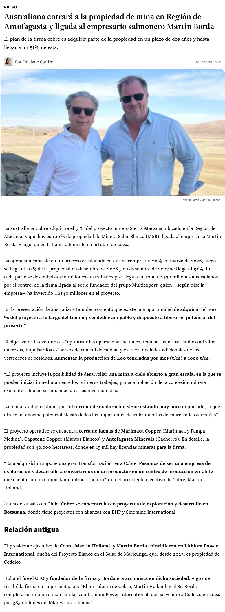 Firma australiana acuerda adquirir 51% de proyecto cuprífero vinculado a Martín Borda - (Diario Financiero)