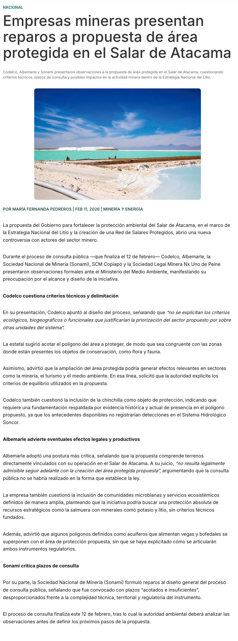 Consulta sobre protección en salar de Atacama preocupa a mineras - (El Mercurio de Santiago)