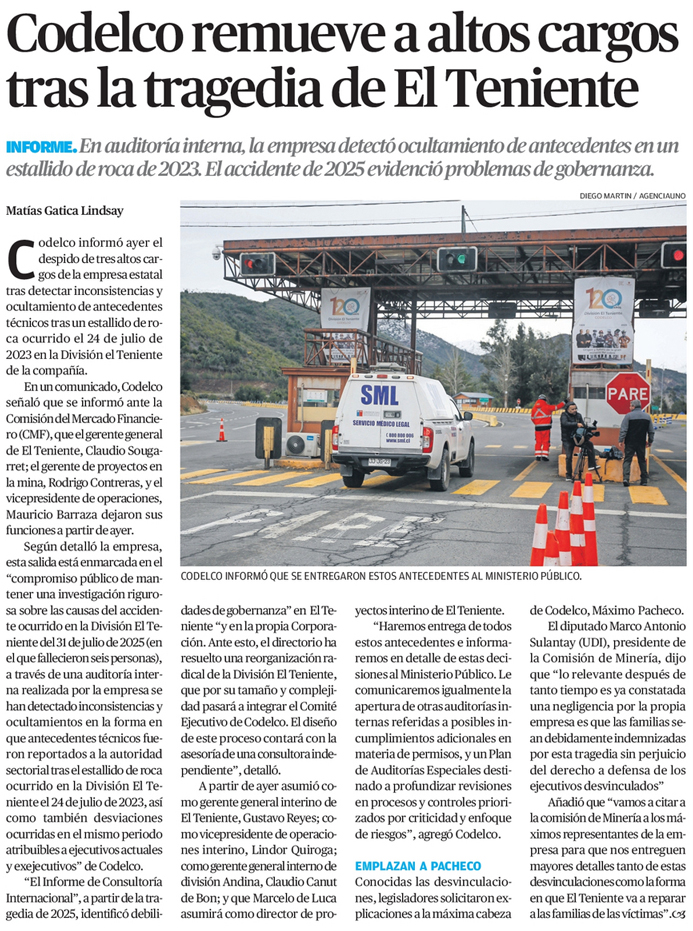Codelco remueve a altos ejecutivos de El Teniente por ocultar información que, según expertos, pudo ser clave para prevenir posterior tragedia - (El Mercurio de Santiago)
