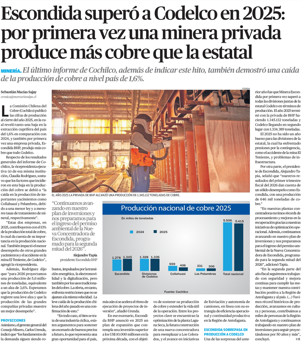 Escondida superó a Codelco en 2025: por primera vez una minera privada produce más cobre que la estatal - (El Mercurio de Calama)