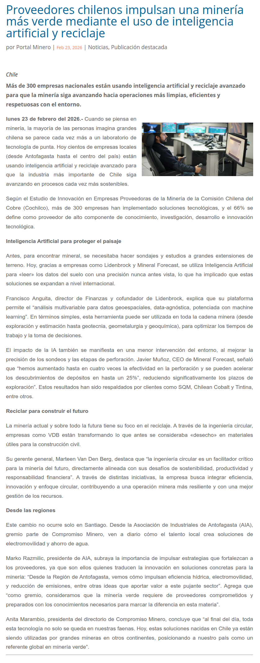 Proveedores chilenos impulsan una minería más verde mediante uso de Inteligencia Artificial y reciclaje - (guiaminera.cl)
