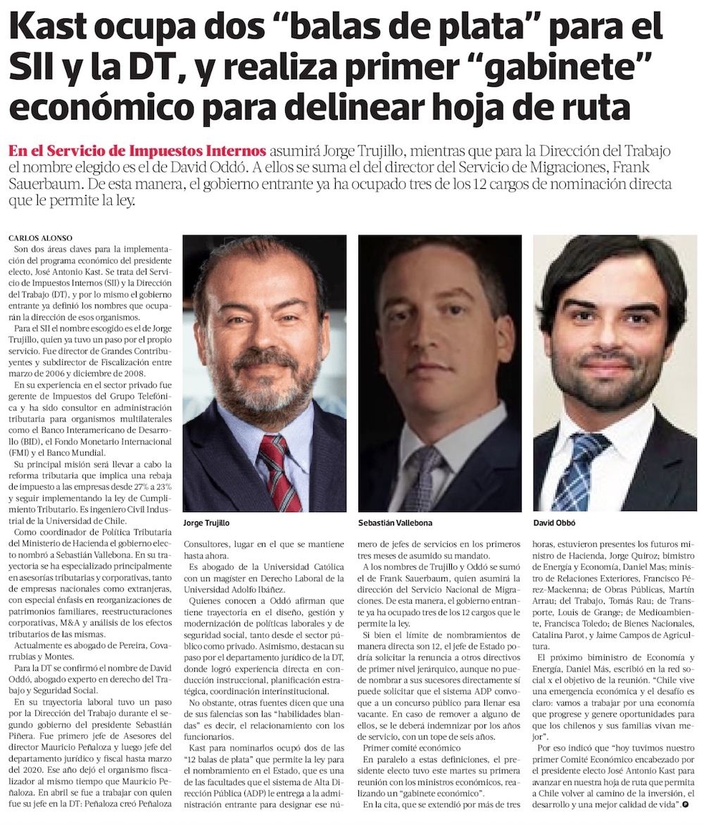 Futuro gobierno designa a los nuevos mandos de los dos principales entes fiscalizadores en el área económica - (El Mercurio de Santiago)