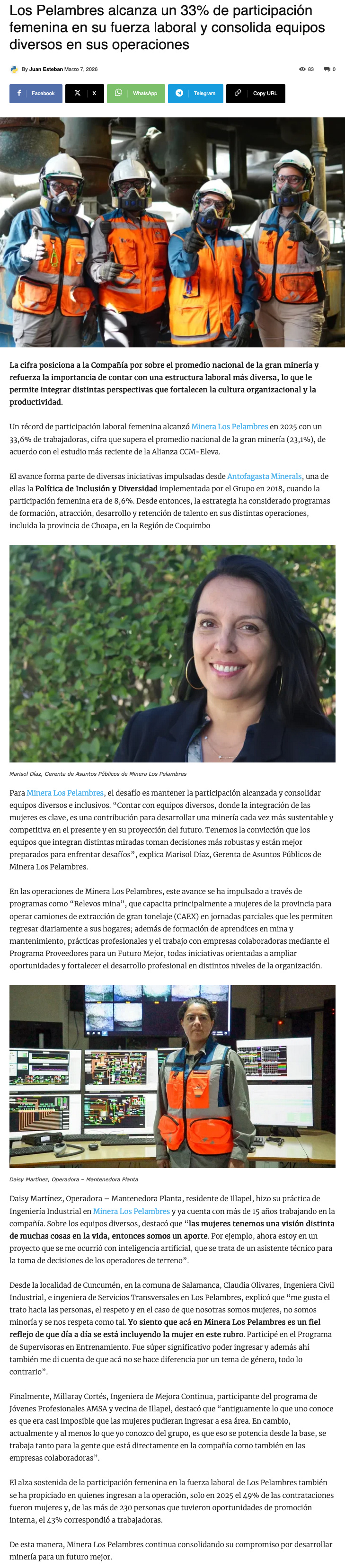 Los Pelambres alcanza un 33% de participación femenina en su fuerza laboral y consolida equipos diversos en sus operaciones - (davidnoticias.cl)