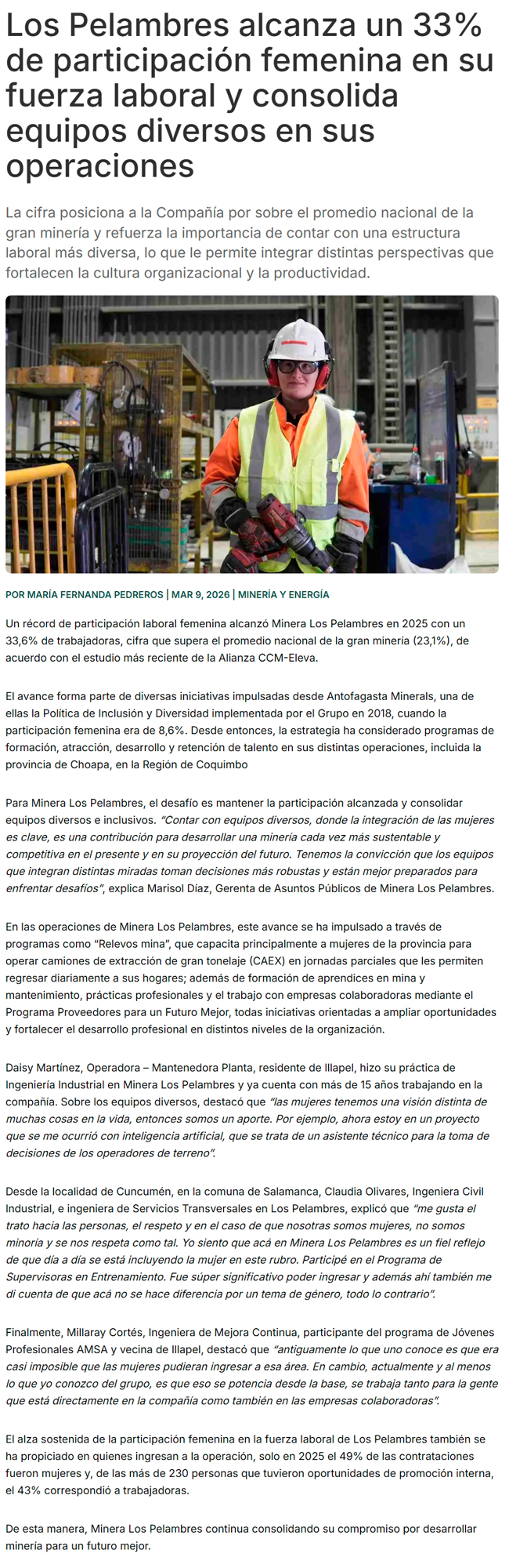 Minera Los Pelambres alcanza 33% de participación femenina y supera promedio de la gran minería - (reporteminero)