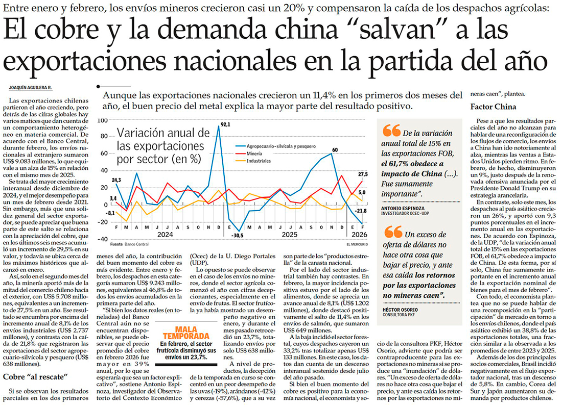 Exportaciones repiten alza en febrero gracias a mejores precios del cobre y pese a caída en la fruta - (Diario Financiero)