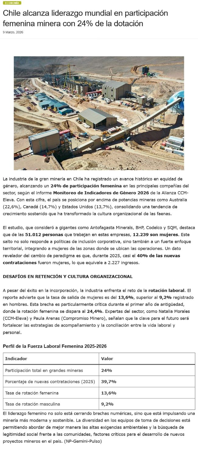 Participación femenina en minería aumentó a 24%: Se superó meta impuesta a 2030 - (cnnchile.com)