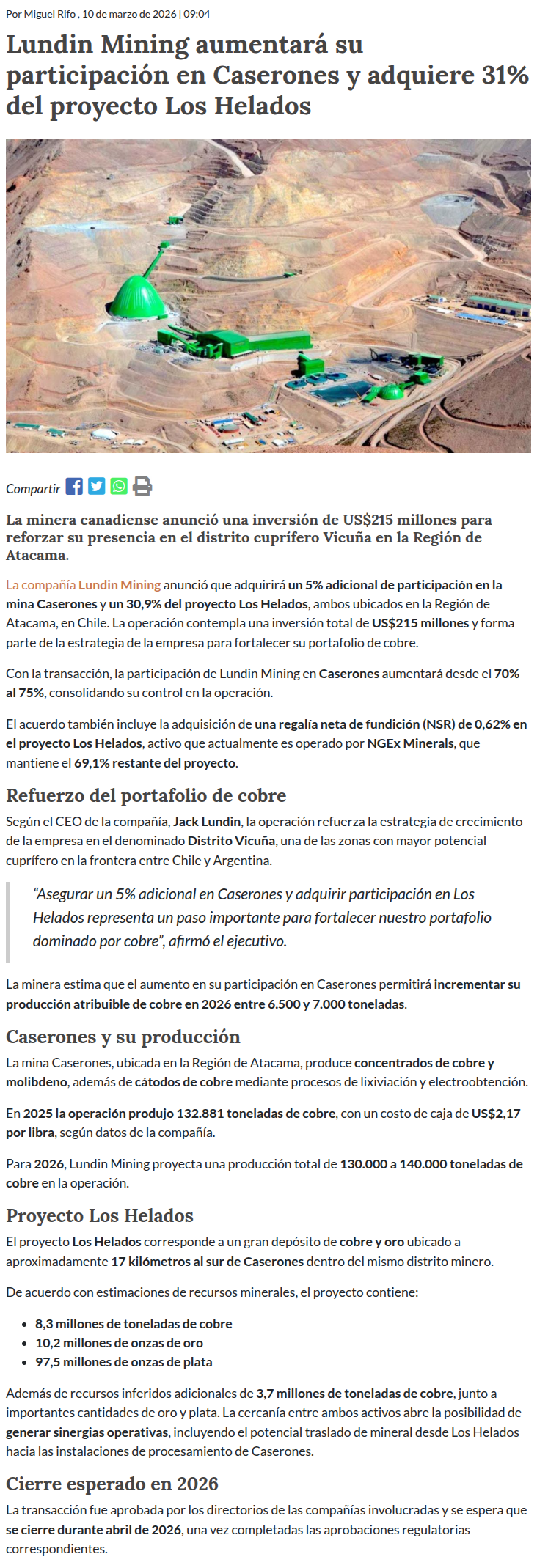 Lundin Mining anuncia aumento del 5% de su participación en mina Caserones y adquiere el 31% de estratégico proyecto de cobre y oro en Chile - (DF Online)
