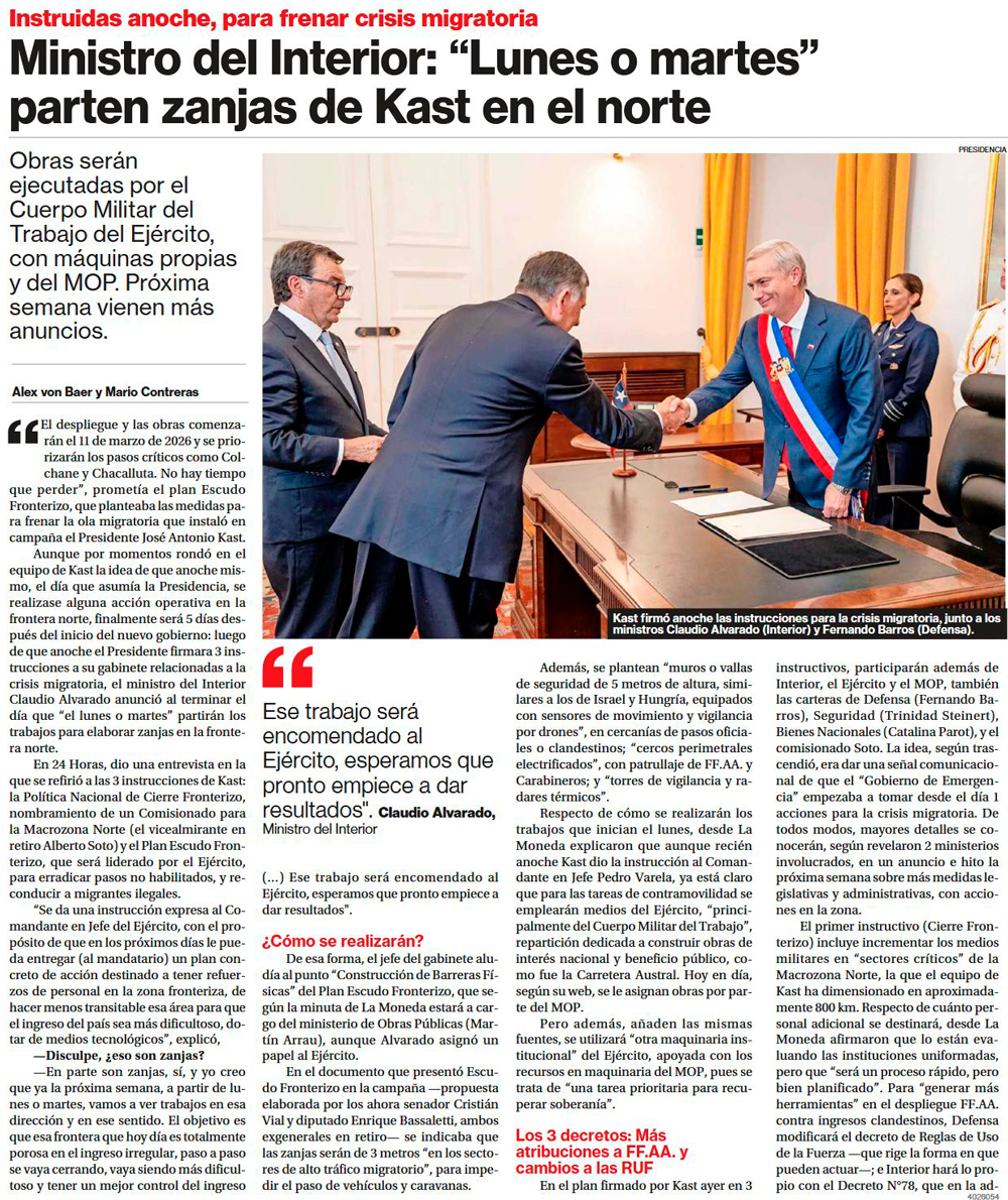 Construcción de zanja comienza la próxima semana y comisionado llega al norte - (El Mercurio de Santiago)