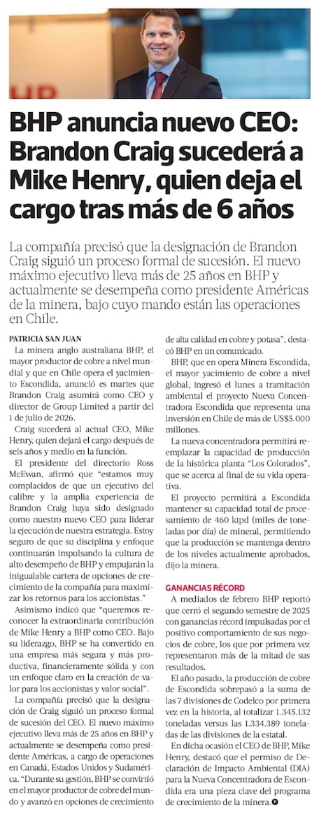 BHP nombra a Brandon Craig como nuevo CEO desde julio y cierra ciclo de Mike Henry tras seis años - (DF Online)