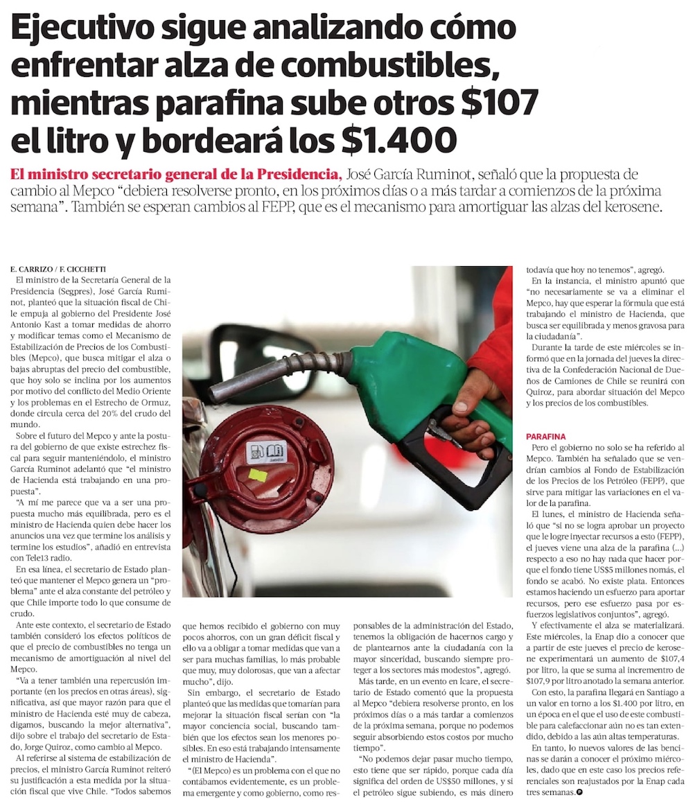 La Moneda baraja distintas opciones de ajuste al Mepco mientras el precio de la parafina se dispara - (Diario Financiero)