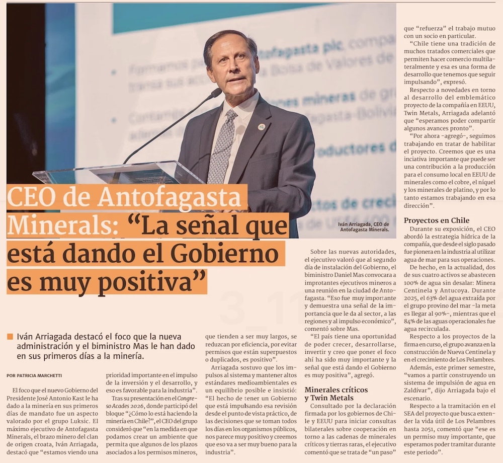 CEO de Antofagasta Minerals por decisión del gobierno de acelerar permisos: “Es favorable para la industria” - (Pulso)