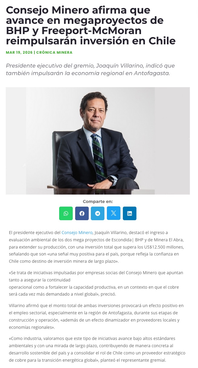 Joaquín Villarino, Presidente Consejo Minero: “El ingreso de proyectos de BHP y Freeport al SEIA es una señal muy positiva para el país” - (territoriominero.cl)