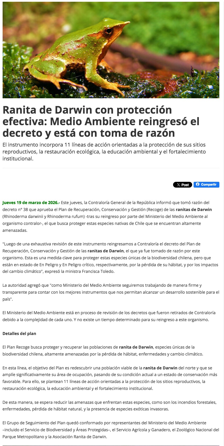 Medio Ambiente reingresa decreto sobre ranitas de Darwin y Contraloría toma razón - (Diario Financiero)