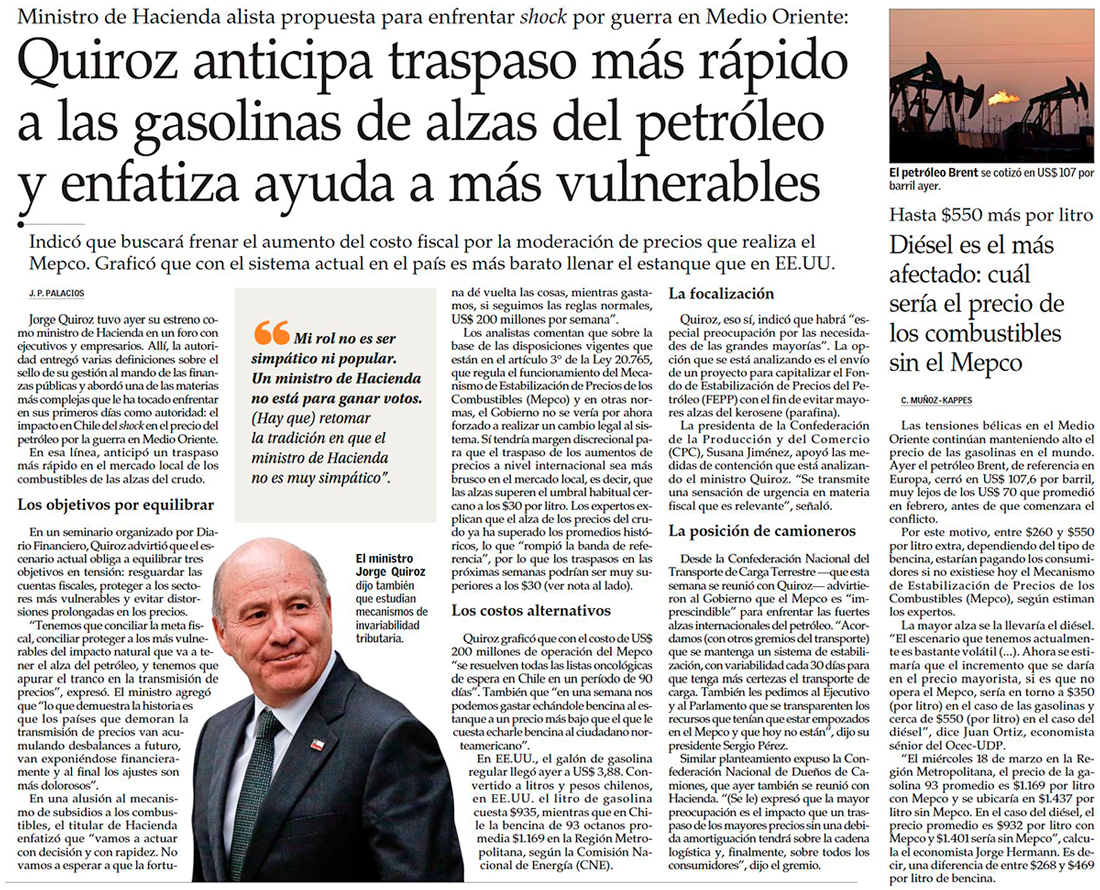 Gobierno opta por asumir costos políticos de alza del combustible y enviará proyecto para focalizar las ayudas en sectores vulnerables - (El Mercurio de Santiago)