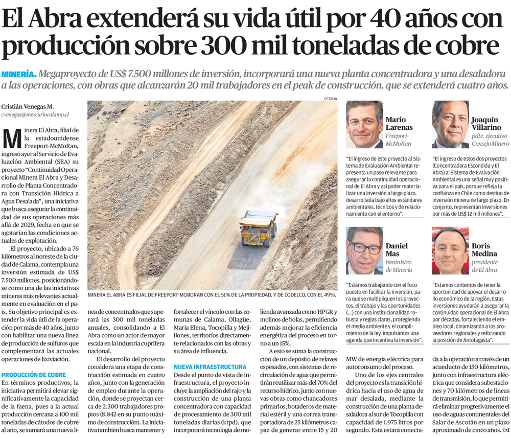 El Abra extenderá su vida útil por 40 años con producción sobre 300 mil toneladas de cobre - (El Mercurio de Antofagasta)