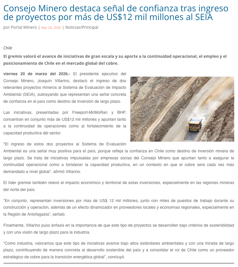 Joaquín Villarino, Presidente Consejo Minero: “El ingreso de proyectos de BHP y Freeport al SEIA es una señal muy positiva para el país” - (territoriominero.cl)