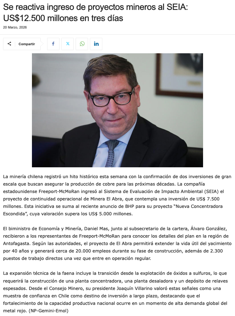 Inyección de confianza: US$12.500 millones en proyectos mineros en solo tres días - (eldiariodesantiago.cl)