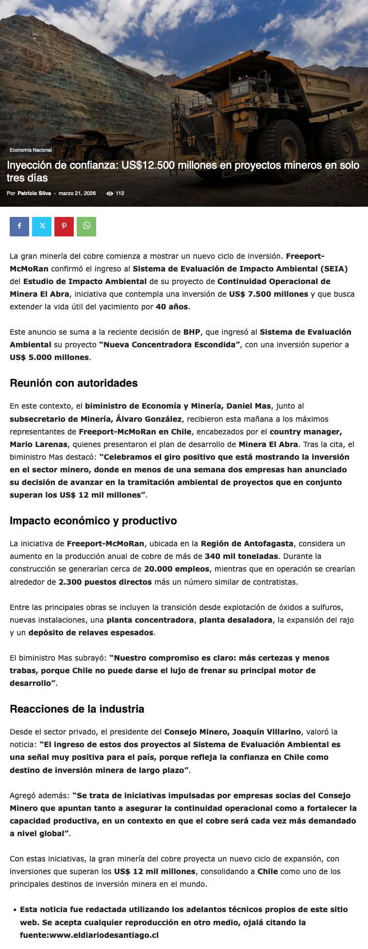 Consejo Minero valora ingreso de proyectos de BHP y Freeport al SEIA como señal de confianza en Chile - (nuevaminería online)