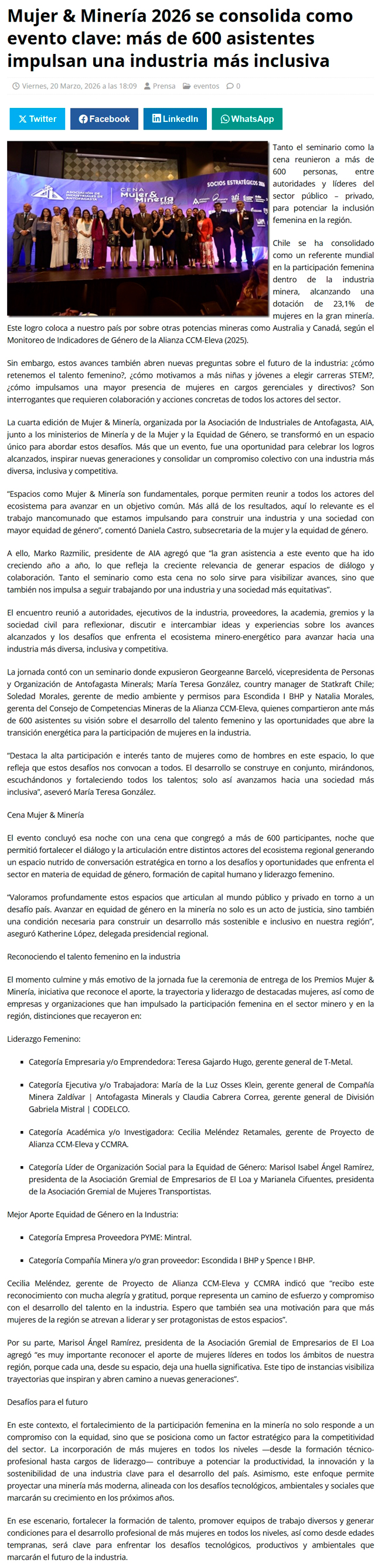 Cena Mujer & Minería 2026: Industria releva contribución de la participación femenina en el desarrollo sectorial - (mch.cl)
