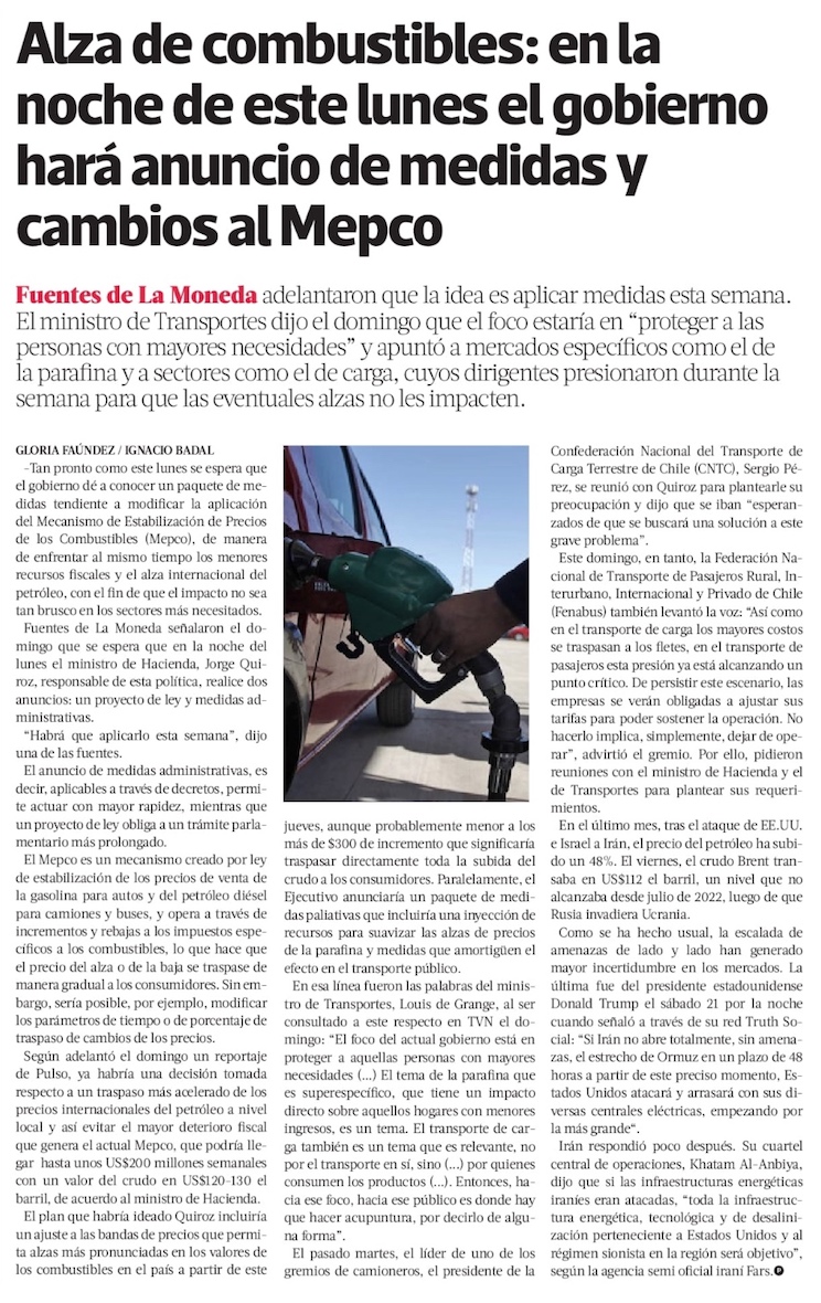 Gobierno alista el fuerte traspaso a precios por el alza del petróleo y surgen las primeras críticas - (El Mercurio de Santiago)