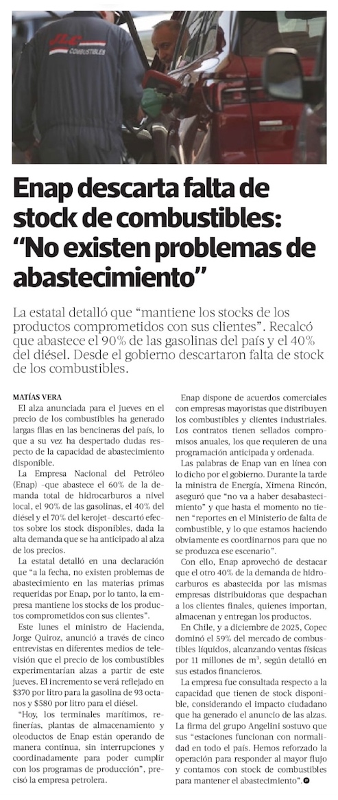 Ministra Rincón y Enap desestiman la posibilidad de un desabastecimiento de combustibles - (Diario Financiero)