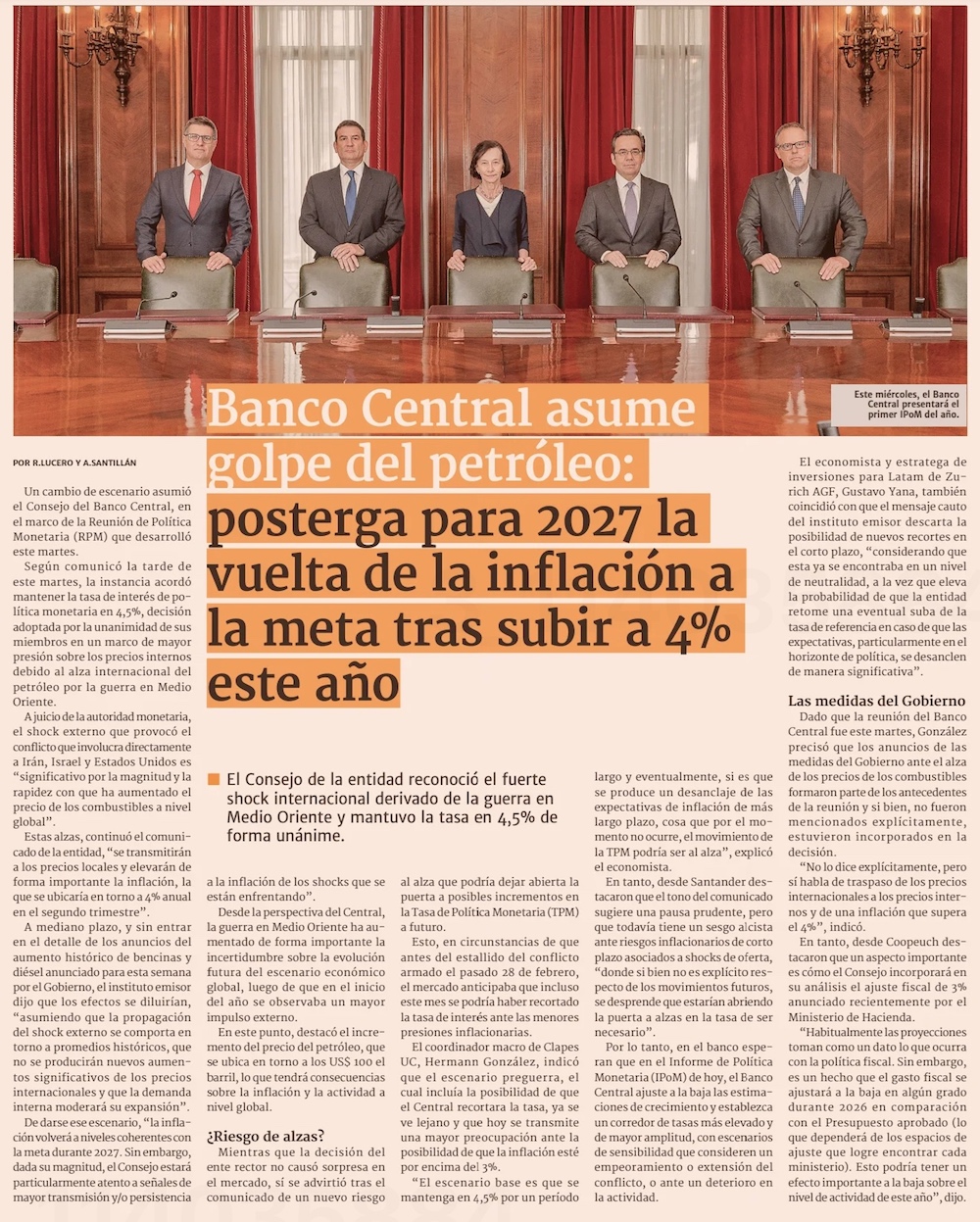 El Banco Central anticipa una mayor inflación y abre una puerta a futuras alzas de tasas de interés - (El Mercurio de Santiago)