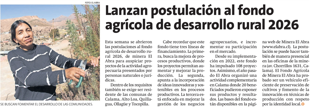 Minera El Abra lanza postulación al Fondo Agrícola de Desarrollo Rural 2026 - (elamerica)