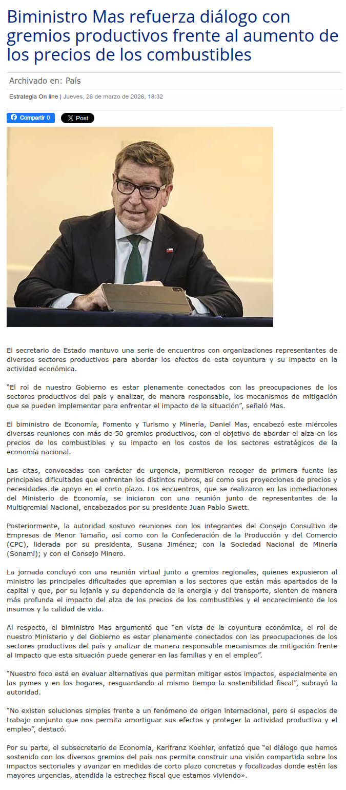 Biministro Mas refuerza diálogo con gremios productivos frente al aumento de los precios de los combustibles - (g5noticias.cl)