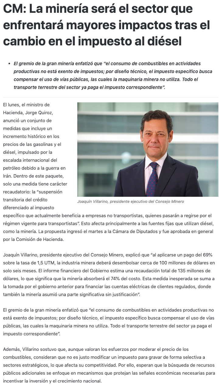 Consejo Minero cifra en US$100 millones el impacto del ajuste al impuesto al diésel y advierte riesgo para la competitividad minera - (redimin)