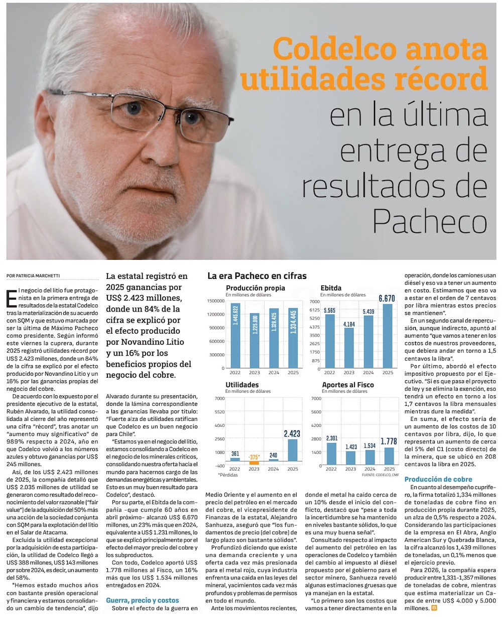 Filial de litio de Codelco dispara en 989% utilidades de la empresa estatal en 2025 - (El Mercurio de Santiago)