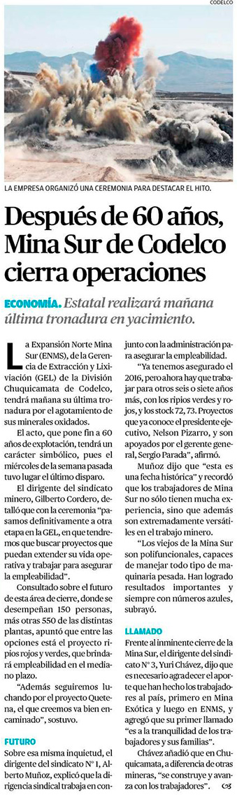 Después de 60 años la Mina Sur tiene mañana su última tronadura - (El Mercurio de Calama)