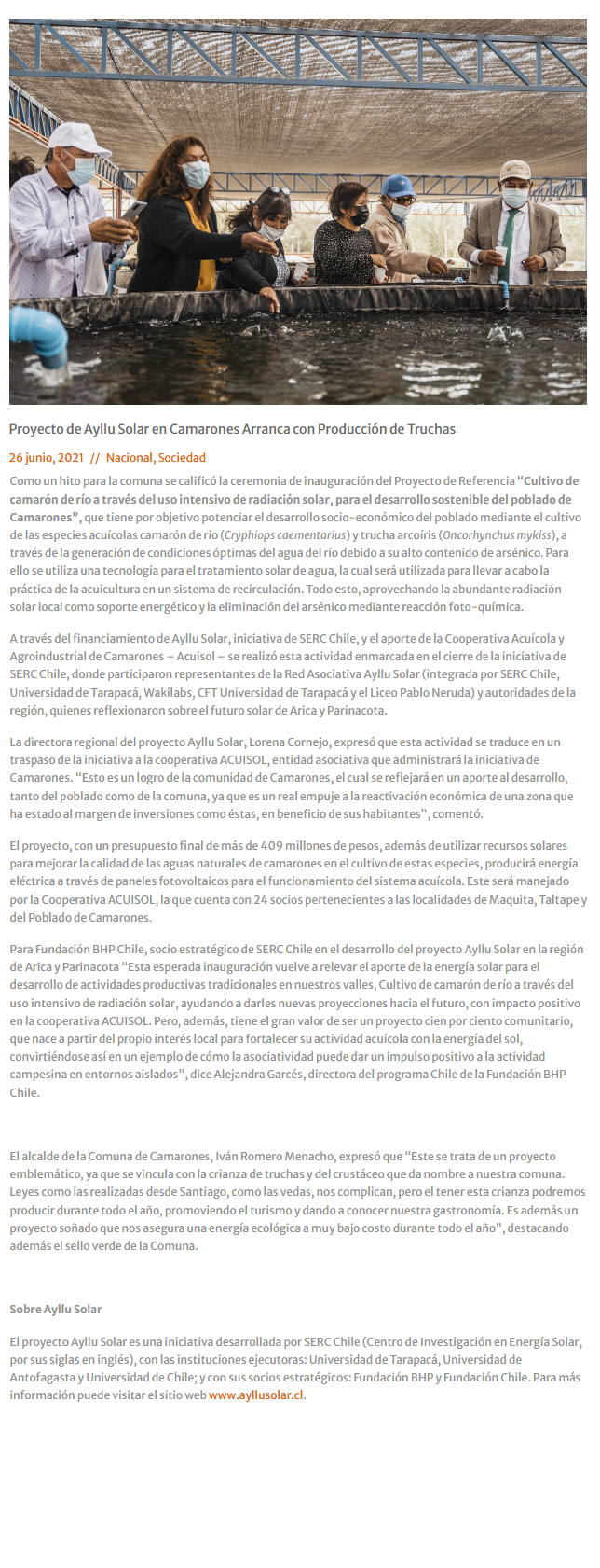 Proyecto de Ayllu Solar en Camarones arranca con producción de truchas - (aricamia)
