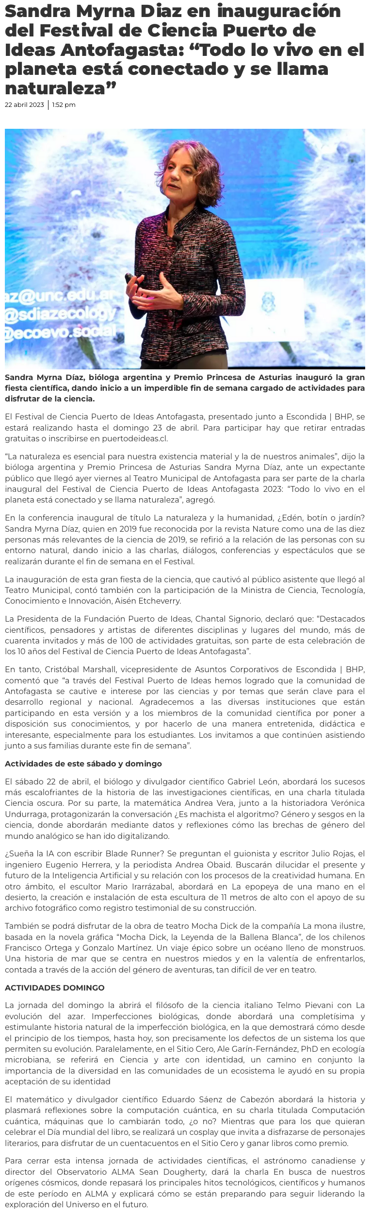 Festival de Ciencia Puerto de Ideas Antofagasta: "Todo lo vivo en el planeta está conectado y se llama naturaleza" - (ovallehoy.cl)