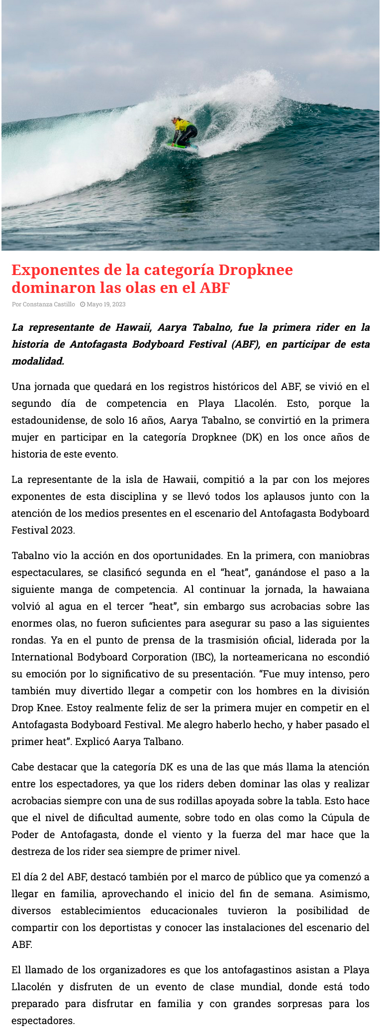La hawaiana Aarya Tabalno hizo historia en Playa Llacolén - (Estrella de Antofagasta)