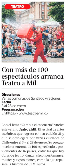 100 montajes nacionales y extranjeros llegan a Santiago a Mil en enero - (El Mercurio de Santiago)