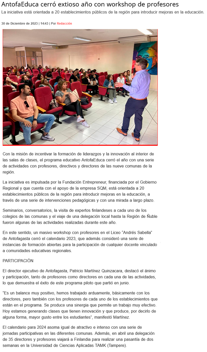 Programa AntofaEduca cierra exitoso año con workshop de profesores - (El Mercurio de Antofagasta)